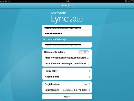 Nel caso sia impossibile accedere al proprio account di Lync Online su Office 365 utilizzando le impostazioni predefinite dalla nostra app su iPad o iPhone, è possibile risolvere il problema modificando manualmente le opzioni di connessione.